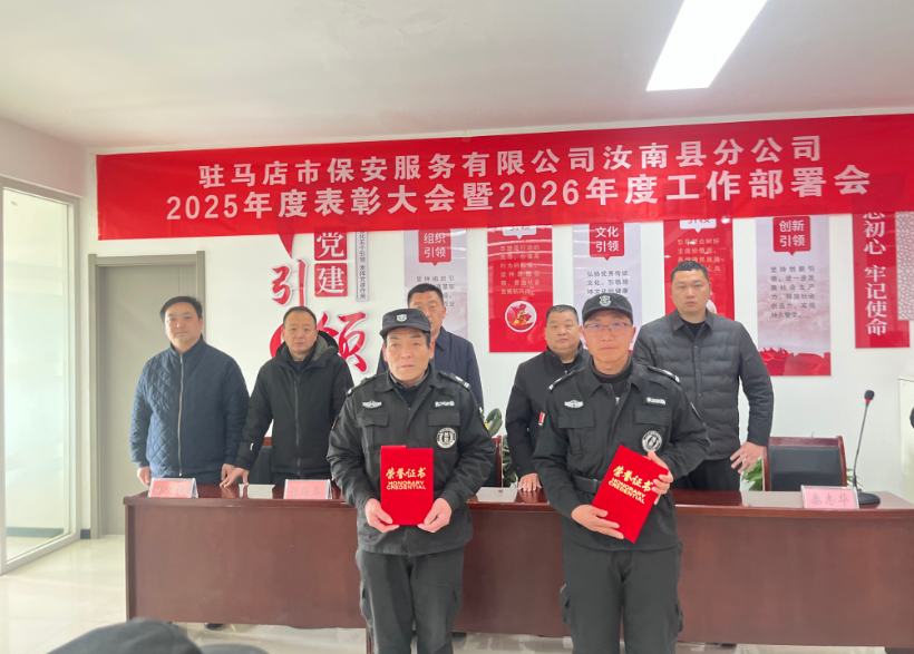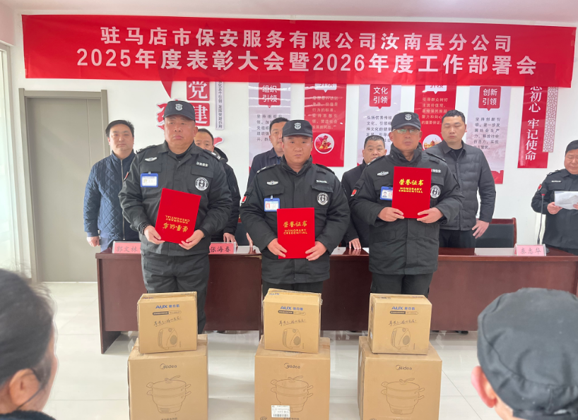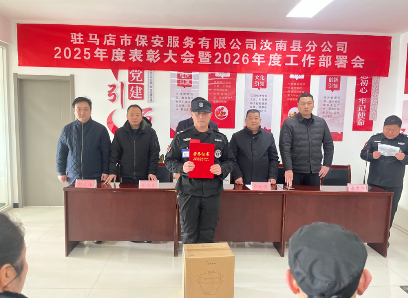 隨后,公司副經(jīng)理喬運強宣讀《2025年度先進集體、先進個人表彰決定》,對2025年在隊伍管理、服務保障、應急處置等工作中實績突出的集體和個人予以通報表彰。大會依次頒發(fā)“先進崗點”“優(yōu)秀大、中隊長”“優(yōu)秀隊員”等先進集體獎項。獲獎代表依次登臺領(lǐng)獎,現(xiàn)場掌聲不斷,充分展現(xiàn)了汝南保安隊伍的優(yōu)良作風與昂揚風貌。