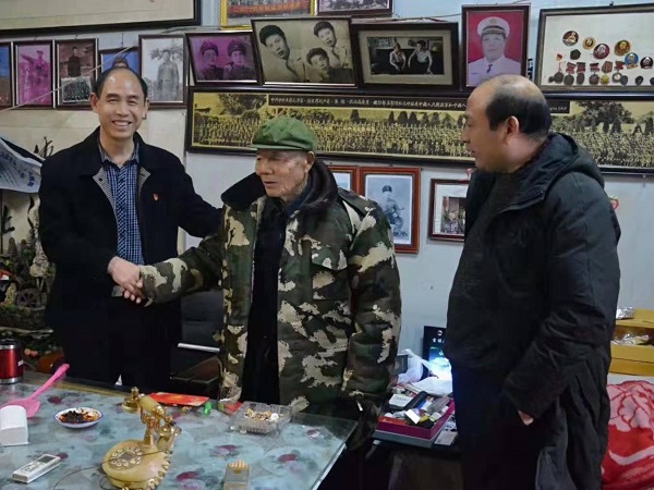 在臥龍街道繩李居委會抗美援朝老兵胡雙喜家,李合成一行與老人暢談起其當(dāng)年打美帝時的軍旅生涯。李合成還親自為老人穿上迷彩軍棉衣。