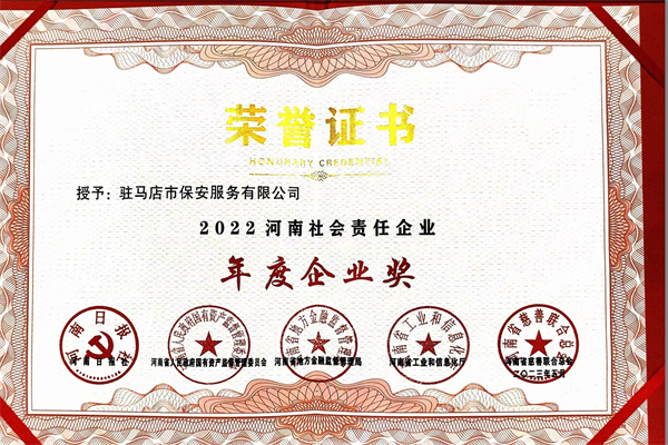2023年5月,駐馬店市保安服務有限公司被河南日報社、河南省人民政府國有資產監(jiān)督管理委員會、河南省地方金融監(jiān)督管理局、河南省工業(yè)和信息化廳、河南省慈善聯(lián)合總會評為“2022河南社會責任企業(yè)”。公司黨總支書記董事長姚紅衛(wèi)被評為“河南社會責任企業(yè)突出貢獻企業(yè)家”。