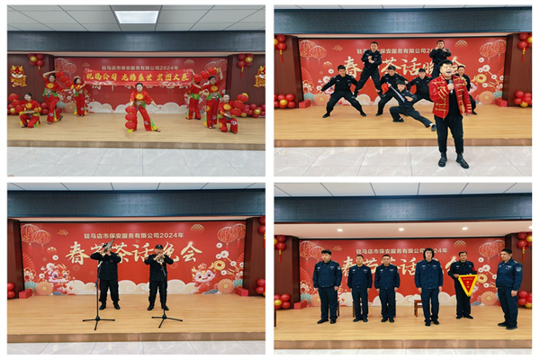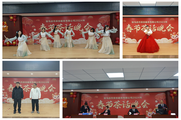 茶話晚會伊始,在大家熱烈的掌聲中,公司黨總支書記董事長姚紅衛(wèi)發(fā)表了2024新春致辭。姚董事長表示,2023年,公司上下拼搏奉獻、砥礪前行,畫出了最大同心圓,凝聚了最大向心力,取得了可喜可賀的成績。我們堅持黨建引領(lǐng)發(fā)展,以國企黨建示范點建設(shè)為牽引,強學(xué)習(xí)、帶班子、促融合、樹典型、正風(fēng)氣,實現(xiàn)了業(yè)務(wù)發(fā)展和安全管理雙豐收、經(jīng)營業(yè)績和經(jīng)營效益雙提升。我們齊心協(xié)力,攻堅克難,確保了員工工資按時足額發(fā)放,做到了員工福利待遇不降反而提升的可喜局面。我們持續(xù)提升了全體保安員整體形象,增強了公司兩級機關(guān)服務(wù)基層的能力。2023年收獲滿滿,捷報頻傳,機關(guān)黨支部評選“五星級黨支部標(biāo)兵”,公司連續(xù)三年被表彰為“河南社會責(zé)任企業(yè)”和“駐馬店市政府采購優(yōu)秀誠信供應(yīng)商”,接連獲得省、市“雙擁共建示范單位”,駐馬店市“誠信服務(wù)示范單位”以及全市唯一職業(yè)技能等級評價龍頭企業(yè)等榮譽稱號?;赝^去,我們?nèi)σ愿啊⒉蝗枋姑o怨無悔;展望未來,我們重任在肩、信心百倍、滿懷豪情。舉辦這次春節(jié)茶話晚會,就是要展示公司員工懷揣夢想、拼搏奮進的精神風(fēng)貌,表達感恩同行、攜手共進的深厚情誼,彰顯揚帆遠(yuǎn)航、再創(chuàng)佳績的堅定決心。希望大家在新的一年,同頻共振、同心同德、踔厲奮發(fā),以高歌猛進的英姿、奮發(fā)有為的風(fēng)貌、昂揚向上的斗志,努力開創(chuàng)更加輝煌燦爛的明天!最后,姚董事長送上了新春祝福。祝愿大家身體健康、工作順利、闔家幸福!龍年如意吉祥。