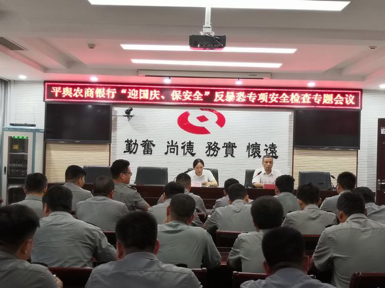 为落实省联社安全保卫工作会议精神和文件要求,切实做好“国庆”期间安防工作,防范各类安全事故,维护正常经营秩序,7月26日,平舆农商行组织押运、特勤、大堂经理和网点保安人员召开“迎国庆 保安全”反暴恐专项安全检查专题会议,平舆农商行副行长吕广燕、平舆农商行保卫科科长侯鸿学主持会议。